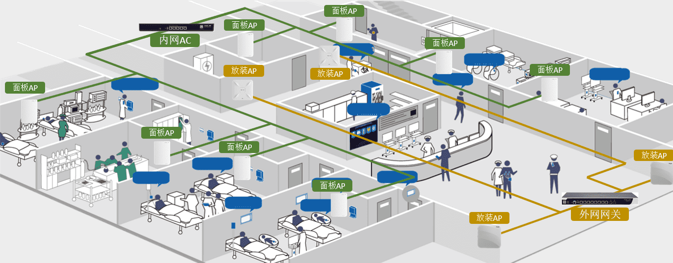 快速部署需求方艙醫(yī)院建設(shè)以速度快為主要特點(diǎn),應(yīng)保證供應(yīng)快、實(shí)施快,不能讓網(wǎng)絡(luò)實(shí)施拖了整體建設(shè)的后腿。無(wú)線接入質(zhì)量需求Internet出口應(yīng)滿足方艙醫(yī)院的醫(yī)患容量;如何保障在有限帶寬下,讓每個(gè)人都擁有公平網(wǎng)絡(luò)流量?如何應(yīng)對(duì)一些視頻類(lèi),大流量用戶問(wèn)題?醫(yī)護(hù)人員和患者使用的手機(jī)品牌及價(jià)格不同,導(dǎo)致了具備的接入能力不同,如何為高中低端手機(jī)提供穩(wěn)定的WiFi接入更為關(guān)鍵;最后,要保障醫(yī)護(hù)人員和患者在移動(dòng)過(guò)程使用WiFi的良好上網(wǎng)體驗(yàn)。基礎(chǔ)設(shè)施齊全需求方艙醫(yī)院網(wǎng)絡(luò)基礎(chǔ)系統(tǒng)設(shè)施應(yīng)該齊備,保證內(nèi)網(wǎng)業(yè)務(wù)正常運(yùn)轉(zhuǎn)及患者基本所需,不應(yīng)出現(xiàn)缺失設(shè)備情況,投入使用后難以補(bǔ)救,造成損失。安全隔離管理需求投入使用之后的方艙醫(yī)院,尤其是污染區(qū)的隔離病房,屬于高危區(qū)域,一旦設(shè)備出現(xiàn)故障,運(yùn)維人員一般很難到達(dá)現(xiàn)場(chǎng)進(jìn)行維護(hù),因此,網(wǎng)絡(luò)設(shè)備應(yīng)支持授權(quán)遠(yuǎn)程運(yùn)維的功能,保障運(yùn)維人員對(duì)內(nèi)網(wǎng)設(shè)備進(jìn)行遠(yuǎn)程維護(hù)、升級(jí)。監(jiān)控承載需求監(jiān)控承載方艙內(nèi)外的安全任務(wù),方艙醫(yī)院內(nèi)有大量監(jiān)控點(diǎn)位,對(duì)網(wǎng)絡(luò)的大流量承載能力提出需求。同時(shí),監(jiān)控點(diǎn)位的部署還要考慮醫(yī)患的隱私。