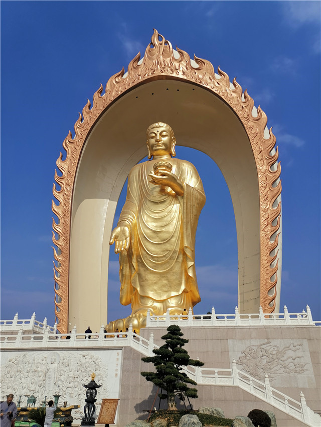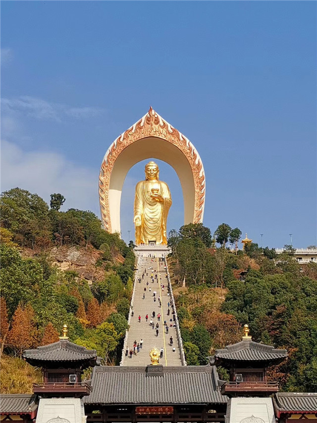 金秋的陽(yáng)光溫馨恬靜,金秋的微風(fēng)和煦輕柔,金秋的藍(lán)天白云飄逸,金秋的田野遍地金黃。團(tuán)建第三天,我們來(lái)到了九江星子縣瞻仰世界最高48米大佛--東林大佛。經(jīng)了解,大佛北依廬山主峰,群山環(huán)抱,山水相連,彌陀壇城,凈宗道場(chǎng),朝圣勝地,是一方集朝圣、修行、弘法、教育、慈善為一體的凈土。高度48米,以表阿彌陀佛發(fā)的四十八大愿??偢?1米,為至火焰寶蓋頂點(diǎn)之距,81米,以表九九八十一,意為修行成佛艱辛不易。在阿彌陀佛像里面,是中國(guó)及全球第一高的。我們帶著無(wú)比虔誠(chéng)的心瞻仰著。此刻的心靈,猶如明鏡一般清澈、透明,遠(yuǎn)離塵囂!