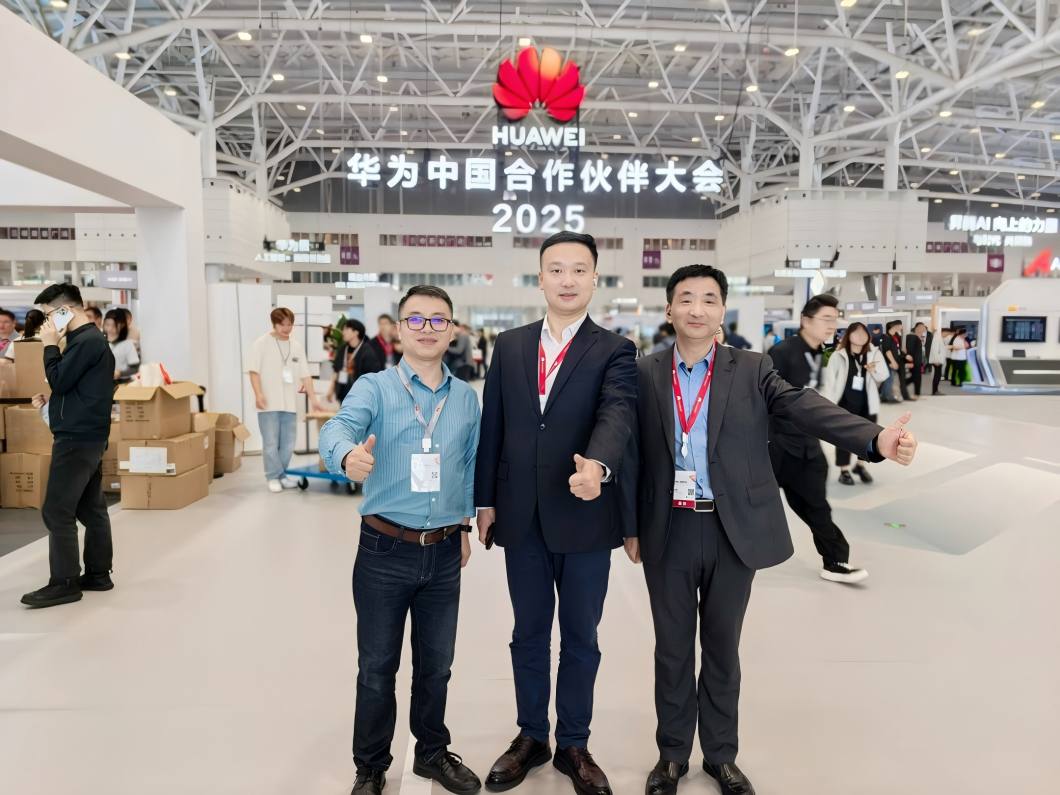 楊成總經(jīng)理與華為中國(guó)政企分銷(xiāo)Marketing與產(chǎn)品GTM部部長(zhǎng)蘇崇俊、華為行業(yè)感知分銷(xiāo)總監(jiān)劉觀祥?合影留念??